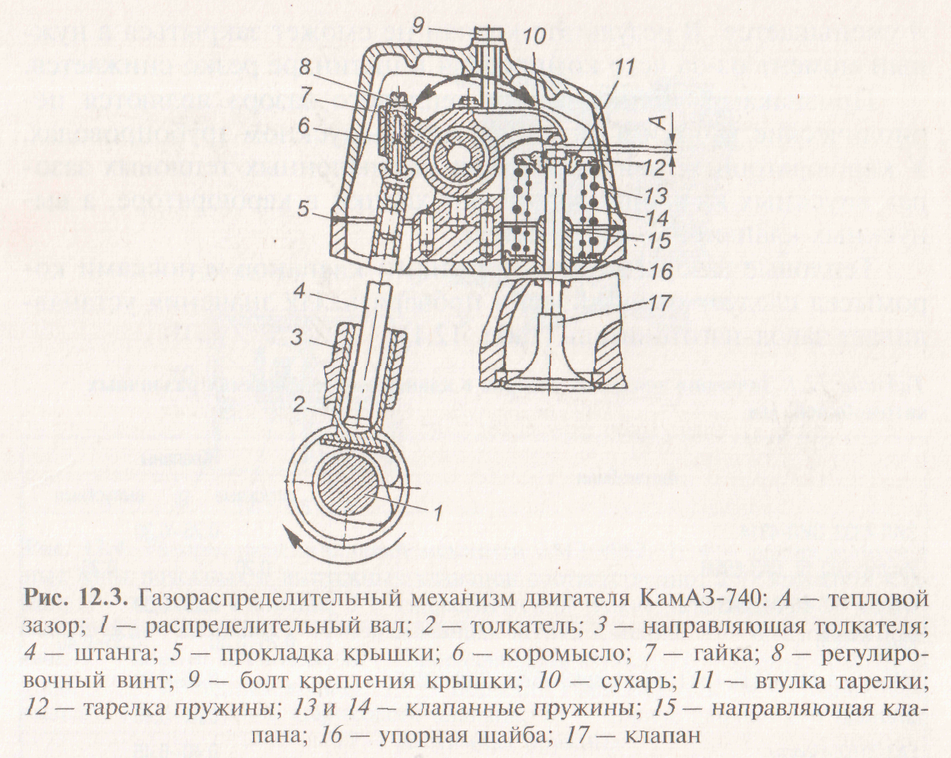 Увеличение теплового зазора приводит к ухудшению очистки цилиндра от отработавших газов, в результате чего уменьшается наполнение цилиндра свежим зарядом воздуха горючей смеси, что ухудшает процесс сгорания. При уменьшенном тепловом зазоре нарушается его посадка в седло, подгорают фаски клапанов и их седла, двигатель работает с перебоями. Если размер теплового зазора меньше требуемого, то клапан 17 нагревается, удлиняется и может коснуться носка коромысла 6. Кроме того, привод, состоящий из кулачка распределительного вала 1, толкателя 2 и штанги 4, также нагревается и удлиняется и воздействует на коромысло, вследствие чего тепловой зазор А уменьшается. В результате клапан не сможет закрыться в нужный момент из-за чего компрессия в цилиндре резко снижается. Признаками уменьшенного теплового зазора являются периодические хлопки в впускном или выпускном трубопроводах. У карбюраторных двигателей при уменьшенных тепловых зазорах впускных клапанов возникают хлопки в карбюраторе, а выпускных клапанов — в глушителе. Тепловые зазоры между стержнями клапанов и носками коромысел следует периодически проверять. Их значения устанавливает завод-изготовитель (табл. 12.1). Таблица 12.1. Значения тепловых зазоров в клапанных механизмах различных автомобилей, мм