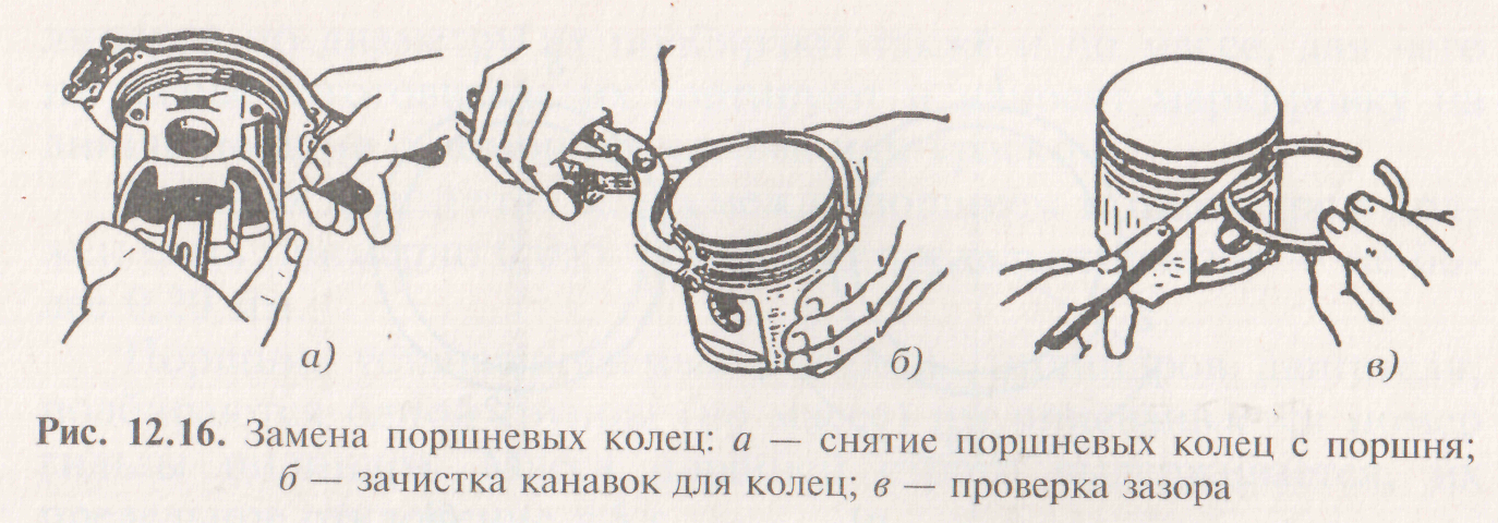 Ремонтные гильзы. Цилиндры можно восстанавливать запрессовкой ремонтных гильз, если их износ превышает последний ремонтный размер или на стенках образовались глубокие риски и задиры. Для этого цилиндры обрабатывают под ремонтную гильзу, толщина которой должна быть не менее 3—4 мм. Перед запрессовкой ремонтной гильзы в верхней части цилиндра выполняют кольцевую выточку под буртик. Гильзы запрессовывают с натягом 0, 05—0, 10 мм на гидравлическом прессе, спрессовывают и обрабатывают (растачивают и хонингуют) до нормального размера. При запрессовке на гильзу надевают резиновые уплотнительные кольца, предварительно смазанные жидким мылом, чтобы не нарушить их посадку в канавку. Перед запрессовкой гильз следует проверить состояние посадочных отверстий под них в блоке цилиндров. Если они сильно подверглись коррозии или имеют раковины, необходимо их отремонтировать нанесением слоя эпоксидной смолы, смешанной с чугунным наполнителем (опилками), который после застывания следует зачистить заподлицо. Края верхней части блока цилиндров должны быть зачищены шлифовальной шкуркой для предотвращения повреждений уплотнительных колец в процессе запрессовки. Замена поршневых колец. Снятие и установку поршневых колец выполняют с помощью специального съемника (рис. 12.16, а). После снятия колец с поршня канавки зачищают с помощью приспособления, показанного на рис. 12.16, б и проверяют боковой зазор между поршневым кольцом и стенкой канавки в поршне (рис. 12.16, в). Перед установкой поршневых колец их подбирают с учетом размеров канавки поршня и цилиндра. Зазор в канавке у новых колец составляет примерно 0, 06—0, 08 мм для верхнего кольца (для дизелей 0, 08—0, 10 мм), 0, 04—0, 07 мм — для среднего и 0, 03—0, 05 мм — для маслосъемного. Зазоры можно контролировать визуально по свободному вращению всех колец в канавках поршня при отсутствии явного торцевого зазора.