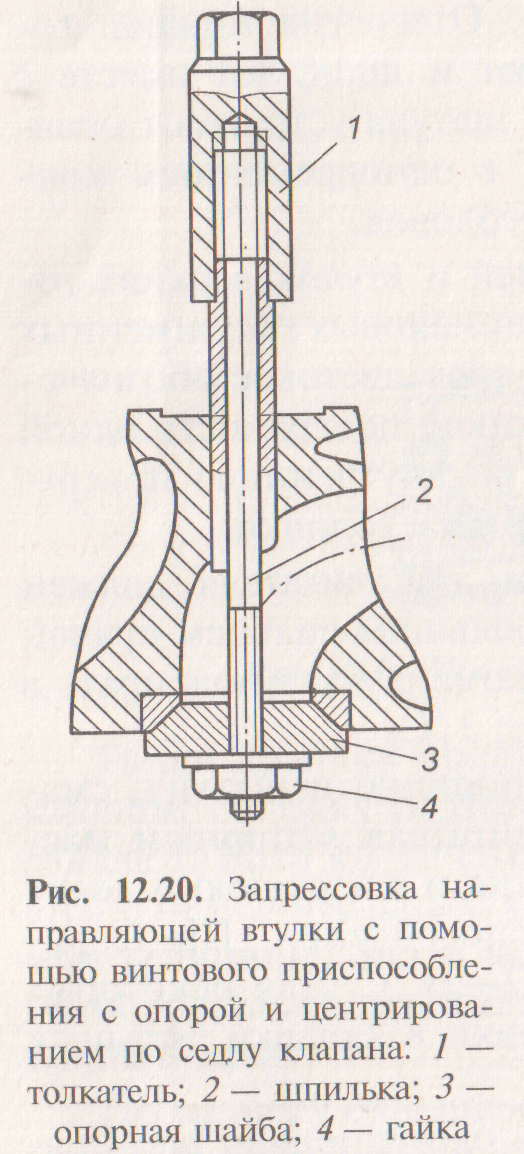 Изнашивание направляющих втулок клапанов головки блока цилиндров приводит к нарушению уплотнения стержня клапана, увеличению расхода масла и повышенному уровню шума при работе двигателя. Дефект устраняется заменой направляющей втулки. Замена старых (дефектных) втулок выполняется на специальных станках или вручную (рис. 12.20) с использованием различных оправок и ударами молотка со стороны седла клапана.