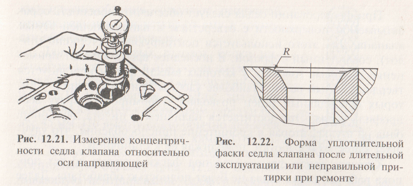 При выпрессовке вручную чугунных или стальных втулок из алюминиевой головки блока цилиндров возникает опасность ее повреждения. Предварительный натяг можно уменьшить, нагрев головку блока цилиндров до 150—180 °С. Из чугунных головок блока цилиндров и алюминиевых с бронзовыми втулками выбивать втулки не трудно, так как натяг небольшой. Натяг при запрессовке новой втулки создается нагревом головки блока цилиндров и (или) охлаждением втулки. Нагрев головки блока цилиндров может быть осуществлен в печи, иногда достаточно нагреть с помощью горячей воды. Для охлаждения втулок применяют жидкий азот или сухой лед. Для пар чугун—чугун и бронза—алюминий нет необходимости в разнице температур. При запрессовке используются специальные приспособления, чтобы не допустить перекоса направляющей втулки относительно седла клапана. После запрессовки втулки следует проверить концентричность седла клапана (рис. 12.21) и при необходимости прокалибровать разверткой отверстия. При этом следует обеспечить зазор 0, 04—0, 05 мм для выпускных клапанов. Для некоторых двигателей поставляемые в качестве запасных частей втулки не требуют калибровки отверстия после установки. Седла клапанов в процессе эксплуатации приобретают форму, отличную от конической: появляется овальность седла по фаске из-за неравномерного изнашивания седла (рис. 12.22). Кроме того, при перегреве и деформации головки блока цилиндров часто возникает несоосность направляющих втулок и седел клапанов. Встречаются случаи, когда на фаске седла (обычно выпускного клапана) появляются раковины из-за нарушения процесса сгорания и перегрева.