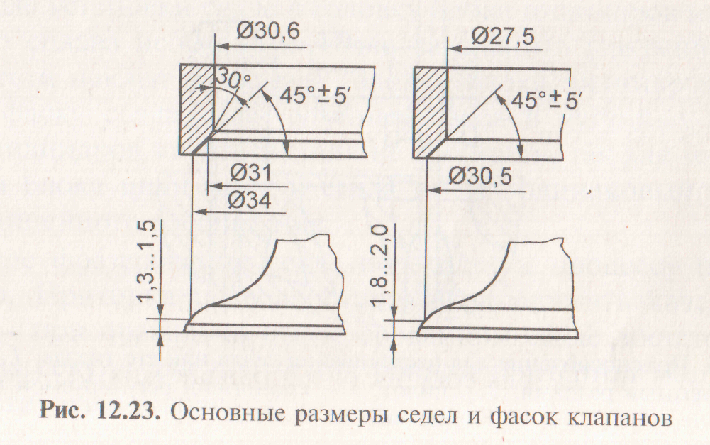 Основными способами ремонта седел клапанов являются фрезерование (растачивание), шлифование и притирка. Фрезерование — наиболее распространенный способ ремонта седел. До фрезерования используются фрезы с различными углами и диаметрами. Углом фрезы обычно считается половина угла при вершине, поэтому фрезы с углом 45° подходят для ремонта большинства двигателей. Значительно реже встречаются седла с углом 30°. На рис. 12.23 приведены размеры седел и фасок впускного и выпускного клапанов. Наиболее часто применяются фрезы с углами 30, 45 и 60°.