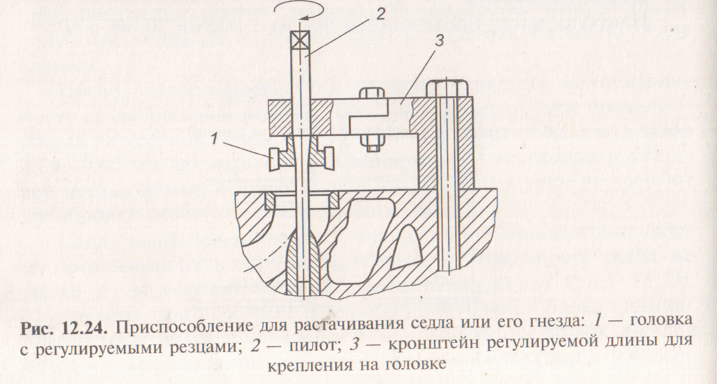При фрезеровании седла следует обеспечить соосность обрабатываемой поверхности с отверстием в направляющей втулке клапана. Для этого используется центрирующий стержень (пилот), соединенный с фрезой. В последнее время находят применение резцовые головки, у которых вместо фрезы используется твердосплавный резец. Наиболее удобны приспособления, у которых специальный резец позволяет сформировать сразу весь профиль седла. Это достигается наличием у пилота двух опор: одна на втулке, вторая в кронштейне приспособления, что улучшает качество обработки, приближая ее к станочной. Сначала седло фрезеруется под фаски клапана до тех пор, пока рабочая фаска седла не будет полностью обработана. Далее другой фрезой, формируют конусную часть, сначала с меньшим углом, затем с большим, таким образом, чтобы ширина фаски стала 1, 5—2, 0 мм для впускного клапана и 2, 0—2, 5 мм — для выпускного. При наличии на фаске седел клапана трещин, раковин, вызывающих ослабление посадки седла в гнезде головки блока цилиндров, их удаляют на вертикально-расточном станке, формируя посадочное место для седла ремонтного размера. Существуют также приспособления для ручного растачивания гнезд под седла в виде специальной головки с резцами -резцедержателя (рис. 12.24), в комплекте с пилотом и специальным механизмом привода. В условиях небольших мастерских такие приспособления заменяют расточной станок, однако они уступают ему в точности обработки поверхности.
