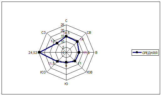 После разработки конструкции здания, в котором протекает технологический процесс по производству заданной продукции, выбирают, обосновывают и описывают, поясняя схемами, удовлетворяющие санитарно-гигиеническим требованиям и нормальному протеканию принятого технологического процесса наиболее экономичные системы отопления (водяное, паровое, воздушное, панельное или лучистое), вентиляции (аэрация или с механическим побуждением, местная или общеобменная), освещения (естественное, искусственное или смешанное), водоснабжения (производственный, хозяйственно-бытовой, пожарный водопровод; оборотное или прямоточное), канализования (общесплавная или раздельная) производственного здания. 3.2 Построение «розы» ветров. Для того чтобы определить господствующее направление ветра, необходимо построить «розу» ветров. Для построения «розы» ветровпо направлению и повторяемости проводят из одной точки прямые по направлению восьми румбов и на каждой из них откладывают столько единиц, сколько раз в этом направлении за отдельный промежуток времени дул ветер, концы отрезков соединяют прямыми. По СНиП 2.01.01-82 (приложение 2) выбирается повторяемость ветра по двум месяцам: январю и июлю (для данного района строительства) и строится график одновременно для двух месяцев. Затем по средним значениям строится другой график, по которому и определяется господствующее направление ветра. Пример: Необходимо построить «розу» ветров и определить господствующее направление ветра для г. Воронежа. Таблица 2 Повторяемость ветра в г. Воронеже