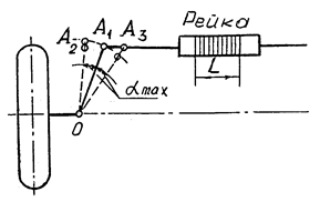 де amax - максимальний кут повороту керованих коліс, град; OАз = m - один з розмірів рульової трапеції. Обчисливши кількість зубців рейки, уточнюють довжину нарізної частини: L=(Z - 0, 5) Pп. Після цього знаходять висоту h та товщину` Sy зуба:
