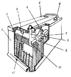 Рис. 1.1. Свинцовая стартерная аккумуляторная батарея: 1 - моноблок; 2 - полублок отрицательных пластин; 3 - пробка; 4 - перемычка; 5 - крышка; б - полюсный вывод; 7 - сепаратор; 8 - борн; 9 - мостик; 10 - полублок положительных пластин.