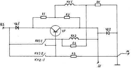 Рис. 4.1. Электрическая схема контактно-транзисторного реле-регулятора РР 362: KV1 – обмотка регулятора напряжения; RK – сопротивление термокомпенсирующее; R1 – сопротивление ускоряющее; R2 – сопротивление добавочное; KV1: 1, KV1: 2 – контакты регулятора напряжения; KV2: 1 - контакты реле защиты; VT – транзистор; VD1 - диод смещения; VD2 – диод гасящий; КV2 – обмотка реле защиты; R3 – сопротивление базы; R4 - сопротивление обратной связи; В3, Ш, М – клеммы реле-регулятора.