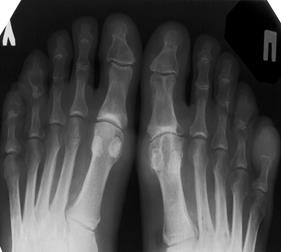 На рентгенограмме правой стопы - субкортикальные кисты 1-го плюснефалангового сустава без эрозий. Мочевая кислота крови - 0, 44 ммоль/л. В синовиальной жидкости – L-10000-20000 кл/мм3. При поляризационной микроскопии синовиальной жидкости из сустава выявлены кристаллические ураты (3-30 мкм, иглообразной формы с двойным светопреломлением). Посев синовиальной жидкости отрицательный. OAK: Эр 4, 4 -1012/л, Нb - 125 г/л, L 16, 4-109/л, СОЭ - 25 мм/ч, Биохимия крови: ЛПНП– до 150 мг/дл, ЛНОНП – 50 мг/дл. холестерин – 8 ммоль/л. Общий анализ мочи: удельный вес -1020, лейкоциты 1-2 в поле зрения, белок-0, 033.