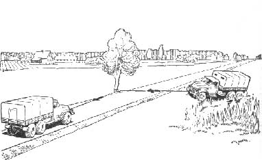 Вождение автомобилей по твердой дороге. Почти любой рейс начинается из населенного пункта, поэтому на каком-то участке движение происходит по шоссе или по твердой накатанной дороге. Эти участки, если они имеют достаточную протяженность, следует проезжать, используя скоростные возможности автомобиля. Давление в шинах при этом необходимо поддерживать на верхнем пределе. Дифференциалы должны быть разблокированы, а передние мосты на автомобилях ГАЗ-66, ЗИЛ-157, ЗИЛ-131 отключены (кроме случаев движения по скользкой дороге). При движении по твердым выбитым дорогам давление в шинах целесообразно понижать на 20—30%. Это повысит плавность хода и среднюю скорость движения, а также снизит напряжение в каркасе шины. На выбитых трассах следует управлять автомобилем так, чтобы колеса правой и левой сторон не попадали во впадины пути одновременно. Это снизит неприятные толчки и тряску. При неожиданном появлении на пути поперечной впадины, углубления или крутого бугра, избежать наезда на которые одновременно двумя колесами невозможно, следует снизить скорость торможением. При этом в момент соприкосновения колес с препятствием колеса должны быть обязательно расторможены, так как наезд на препятствия с заторможенными колесами вызывает сильный удар и может служить причиной поломки подвески. При экстренном торможении на скользкой дороге тормозить следует, не допуская юза и не выключая сцепление. Лучше тормозить серией повторных нажимов на тормозную педаль, следующих друг за другом. Одновременно все внимание должно быть сосредоточено на гашении склонности автомобиля к заносу. В момент начавшегося заноса необходимо немедленно прекратить торможение и плавно повернуть рулевое колесо в сторону заноса до его прекращения, затем вернуть рулевое колесо в исходное положение и продолжать прерывистое торможение. Резкая работа рулевым колесом в таких ситуациях крайне опасна и может привести к полной потере управляемости автомобиля. Многие опытные водители при встрече с разбитыми участками шоссе съезжают на обочину или полевую дорогу, которая идет параллельно шоссе — это обычно позволяет повысить среднюю скорость и снизить утомляемость от тряски.