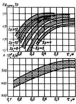 Основным фактором, ограничивающим линейную нагрузку, является нагрев обмотки, так как с возрастанием в ней увеличиваются электрические потери. Допустимое значение линейной нагрузки зависит от класса нагревостойкости применяемой изоляции, а также от конструктивного выполнения машины и, прежде всего, от способов ее охлаждения. Приведенные на рис. 10.9 и 10.10 значения получены по данным выпускаемых в настоящее время синхронных машин защищенного исполнения с косвенным воздушным охлаждением, имеющих изоляцию класса нагревостойкости В. При применении изоляции класса нагревостойкости линейную нагрузку следует увеличить в 1, 12 раза, а при применении изоляции класса нагревостойкости H — в 1, 2 раза.