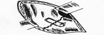 Круговой узловой шов на кости. После обнажения линии перелома, обработки и сопоставления костных отломков с учетом вышеописанных правил, отступя от линии перелома на 1-1, 5 см, проделывают сквозные отверстия перпендикулярно толщине кости. После проведения шовного материала через костные каналы стягивают концы кости и закрепляют нити (проволоку) (рис.38).
