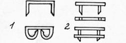 Рис.45. 1) вид металлической скрепки и принцип соединения ткани 2) синтетическая рассасывающаяся скрепка соединяет ткани по-другому.