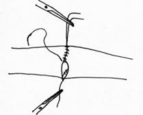 Узловой шов. Преимуществом узлового шва (рис.48) является возможность сохранения герметичности при развязывании одного узла за счет держащих соседних швов; узловые швы оказывают равномерное и незначительное натяжение нитей по периметру анастомоза, в меньшей степени нарушают кровообращение в линии соустья, незначительно деформируют просвет анастомоза.