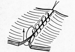 Непрерывный шов. Сведения об узловом и непрерывном кишечном шве противоречивы. Сторонники непрерывного шва (рис.47) относят к достоинствам его большую герметичность, лучший гемостаз, экономию времени при формировании анастомоза, меньшую вероятность выпадения слизистой оболочки между швами. Недостатки непрерывного шва состоят в невозможности быстрого прорезывания шва в просвет кишки, а вследствие длительной задержки лигатур в стенке кишечной трубки в области операционной раны возникают нагноительные процессы, что способствует удлинению сроков регенерации. Кроме того, возникновению анастомозитов и