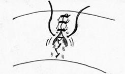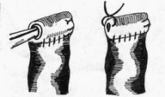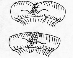 Рис.79. Наложение на кишечную рану серозно-мышечных узловых швов в поперечной к оси кишки направлении.