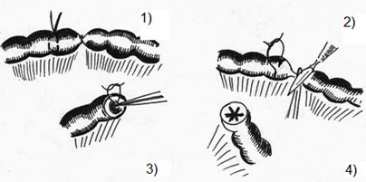 Рис.85. Формирование кишечной культи по Дуайену: 1 – наложены поперечная лигатура и кисетный шов; 2 – пересечение кишки по зажиму; 3 – погружение культи; 4 – формирование культи закончено.