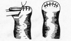 3) по способу Мошковича (рис.87) - формирование культи накладыванием непрерывного или узлового шва над внедренным вглубь кишки зажимом.
