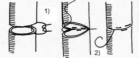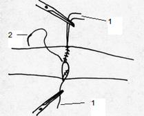 Рис.106. Шов Морозовой с двумя держалками: 1 – швы-держалки; 2 – непрерывный обвивной шов.