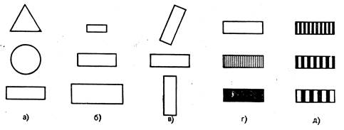 Рис.5.3 Графические переменные (по Ж.Бертену) а – форма; б – размер; в – ориентировка; г – насыщенность цвета (светлота); д – внутренняя структура