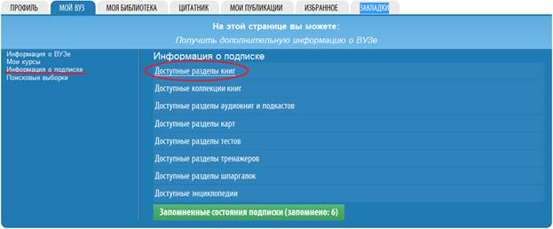 3. Информация о подписке В данном подразделе отображены все доступные Вам разделы и коллекции. Вы можете оформить рассылку на новинки ЭБС. Для этого кликните на «Доступные разделы книг».