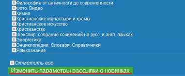 В открывшемся списке отметьте интересующие Вас разделы (или «Отметить все») и нажмите «Изменить параметры рассылки о новинках». Рассылка будет приходит на адрес эл. почты, указанный в разделе «Профиль». Обратите внимание на то, что в разделе «Профиль» должно быть отмечено «Получать рассылку».