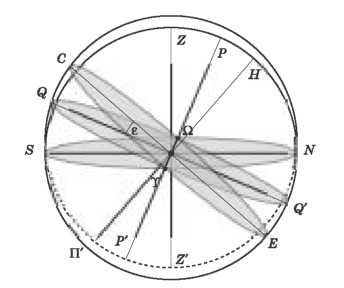 Рис. 6. Небесна сфера: геометрично правильне зображення в ортогональній проекції Кут нахилу осі світу до площини математичного горизонту (висота полюса світу) дорівнює куту географічної широти місцевості. Велике коло небесної сфери, площина якого перпендикулярна до осі світу, називається небесним екватором (QQ'). Велика окружність, що проходить через полюси світу і зеніт, називається небесним меридіаном (PNQ'Z'P'SQZ). Площина небесного меридіана перетинається з площиною математичного горизонту по прямій полуденній лінії, що перетинається з небесною сферою у двох точках: півночі (N) і півдня (S). Північний полюс світу знаходиться в сузір’ї Малої Ведмедиці, у 0, 51° від зорі α Малої Ведмедиці, що називається «Полярна зоря». Південний полюс світу знаходиться в малопомітному сузір’ї Октанта. Близькість Полярної зорі до Північного полюса світу дозволяє орієнтуватися й визначати широту місцевості за спостереженнями Полярної зорі. Видимий річний рух Сонця на тлі зір відбувається по великій окружності небесної сфери — екліптиці (рис. 7). Напрямок цього повільного руху (близько 1° у добу) протилежний до напрямку добового обертання Землі. Вісь обертання Землі має постійний кут нахилу до площини обертання Землі навколо Сонця, що дорівнює 66°33'. Цей кут е між площиною екліптики і площиною небесного екватора для земного спостерігача становить: ε = 23°26'25, 5".