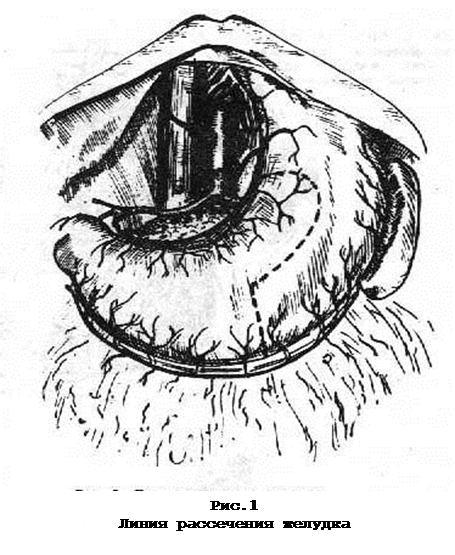 Мобилизацию желудка заканчивают пересечением непосредственно под кардией основных желудочных ветвей блуждающего нерва вместе с элементами связочного аппарата, идущими спереди и сзади малой кривизны. Со стороны большой кривизны желудка в точке, соответствующей ее половине, перпендикулярно к длине оси желудка накладывают сшивающий аппарат УКЛ – 40 или УО-40. Ушитая часть желудка со стороны большой кривизны соответствует ширине трубчатой культи в ее дистальном конце. Затем на желудок в области малой кривизны на 5 см ниже кардии накладывается «держалка». Нитка этого шва является ориентиром дальнеших манипуляций. Аппаратом УКЛ-40 со стороны малой кривизны чуть выше нитки – метки под углом 45° к продольной оси желудка на протяжении 4 см аппаратом УО-40 сшивают стенки желудка.