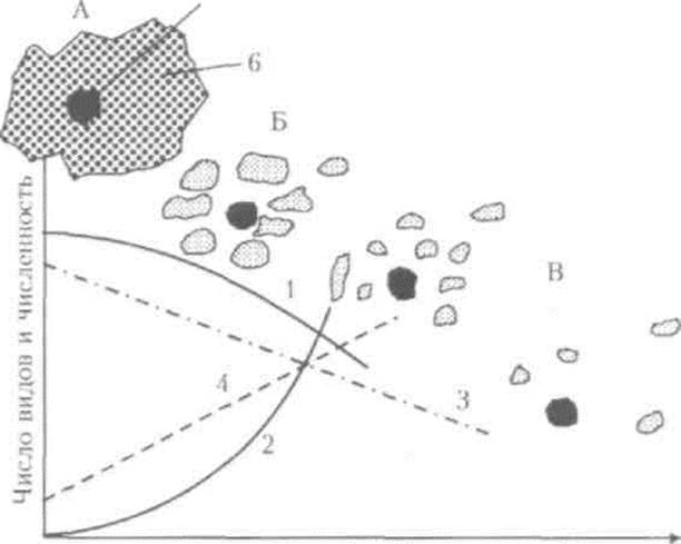 Рис. Изменение экологической обстановки в заповеднике под влиянием фрагментации окружающих территорий и усиления островного характера самого заповедника А— заповедник, окруженный коренными сообществами, Б —начало фрагментации окружающих территорий, В — усиление островного эффекта в связи с возрастающей фрагментацией окружающих заповедник территорий; 1 — видовое богатство аборигенной флоры; 2 — видовое богатство адвентивной и синантропной флоры; 3 — количество крупных хищников; 4 -межвидовая конкуренция крупных растительноядных; 5-территория заповедника; 6 -окружающая природная территория Теория островной биогеографии и возможность ее приложения к проблемам охраны природы — в частности, к вопросам оптимальных размеров и структуры ОПТ — вызвала большой интерес, не ослабевающий до последнего времени, особенно в связи с проблемой видового разнообразия. Положения островной биогеографии, важные при планировании, организации и функционировании заповедников, следующие: · число видов, которое резерват способен поддержать в равновесии, является функцией его величины и степени изоляции; · крупные и расположенные близко друг к другу резерваты содержат большее число видов; · при сохранении части разрушенного обширного местообитания в виде резервата, в нем сначала будет находиться больше видов, чем он сможет вмещать при установившемся равновесии. Избыток постепенно исчезнет. В мелких резерватах темпы исчезновения будут выше, чем в крупных. Оценка этих темпов вымирания видов возможна далеко не во всех случаях; · разные виды требуют различных минимальных территорий, обеспечивающих им реальный шанс на длительное выживание; · число видов находится в прямой зависимости от разнообразия экологических условий острова (резервата); · существуют некоторые геометрические структурные принципы, позволяющие оптимизировать функции резервата для более надежного сохранения видов. Это положение прямо не вытекает из теории островной биогеографии но приобретает все большее значение как один из способов улучшения структур изолированных особо охраняемых природных территорий, и ему стали уделять достаточно серьезное внимание. Появление теории островной биогеографии, особенно ее части, имеющей отношение к ОПТ, вызвало неоднозначное отношение. Особенно острый спор разгорелся вокруг утверждения, что большой резерват предпочтительнее нескольких мелких, так как в нем реально сохранение более высокого видового богатства. Одни исследователи отрицали это положение чисто теоретически, другие - на основании экспериментов. В конечном счете, противоположные позиции несколько сблизились, что позволило более обстоятельно и спокойно продолжать исследования в этой области. Сторонники создания небольших ОПТ утверждали, что для сохранения высокого видового разнообразия нет необходимости в крупных охраняемых территориях. Их аргументы сводятся к следующему: · несколько маленьких резерватов могут содержать больше видов, чем эквивалентный по площади один, а поэтому они предпочтительнее. Проверка этой гипотезы показала, что в целом она справедлива для растений и насекомых. В отношении птиц и млекопитающих все обстоит сложнее. · один большой резерват, содержащий небольшую часть региональной биоты, может оказаться совершенно недостаточным