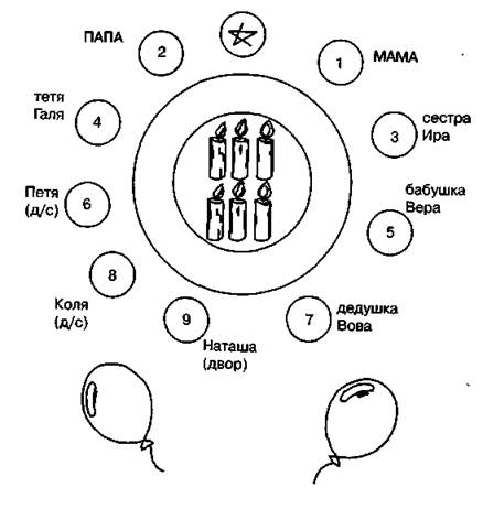 1. Потребность в общении: а) желает общаться в широком кругу — используются все «стульчики» или добавляются новые; б) желает общаться, но с близкими людьми, в ограниченном кругу— «убираются» (зачеркиваются) «стулья»; в) несформированная потребность в общении — выбор игрушек, предметов, животных. 2. Эмоциональные предпочтения в общении: близкие, доверительные, приятные отношения — люди располагаются рядом с «именинником». 3. «Значимость социальных окружений: а) количественное преобладание взрослых, детей, предметов — наличие опыта общения с ними; б) преобладание какой-то группы (семья, детский сад, школа, дсор, дача и т.д.) — значимая среда в общении; в) половое преобладание в общении — наличие мальчиков и девочек, женщин, мужчин. Психолог, педагог, предлагая ребенку игру «День рождения», прикасается к личному миру малыша. Необходимо помнить о доверительном контакте с ним. В тест погружают постепенно, вначале лучше побеседовать о дне рождения, нарисовать атрибуты дня рождения, поиграть в рисунки. Поэтому желательно не использовать заготовки, а создать образ праздничного стола вместе с детьми. И если «стулья» будут разной величины, то можно проанализировать выбор ребенком собственного места, тенденции на лидерство (крупный «стул») или неуверенность (маленький «стул»). В том случае, когда социальная проба не даст психологу необходимую информацию, можно повторить игру, предложить нарисовать еще стол: для взрослых (если за предыдущим столом располагались только дети) или для детей (если за предыдущим столом располагались только взрослые), а может быть, стол для людей (если за предыдущим столом располагались только игрушки, предметы, животные). Новый стол начинаем вновь с пирога, со свечек, со звездочки или снежинки и задаем уже знакомые вопросы.