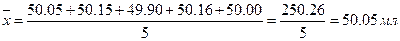 пример 4. Найдите отклонения от среднего и среднее отклонение результатов определения объема колбы (мл): 50.05; 50.15; 49.90; 50.16; 50.00. Решение. Находим среднее выборки: