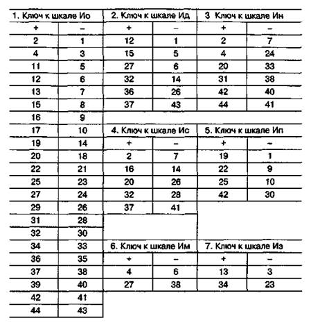 Обработку заполненных ответов следует проводить по приведенным ключам, суммируя ответы на пункты в столбцах «+» со своим знаком и ответы на пункты в столбцах «-»с обратным знаком.