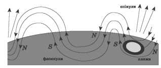 Рис. 2. Утворення протуберанців Активні області виникають внаслідок спливання потужної трубки магнітного потоку з магнітного шару біля основи конвективної зони. Разом із плазмою піднімаються «вморожені» у неї магнітні поля з індукцією 0, 2-0, 3 Тл, що виникають внаслідок неоднорідності обертання Сонця й мають складну структуру, яка в ході руху набуває петлеподібної форми. Гігантські стійкі біполярні магнітні області мають два полюси протилежної полярності, що з’єднуються системою арок завдовжки до 30 000 км і заввишки до 5000 км. Вершини арок повільно піднімаються; біля полюсів арок сонячна речовина повільно стікає вниз (рис..2). У фотосфері активні області розщеплюються на безліч тонких трубок, напруженість магнітного поля у яких становить 1.103 — 2.103 Е. Вони утворюють смолоскипові поля. Області перетинання тонких магнітних трубок з фотосферою спостерігаються у формі груп сонячних плям. Дехто з учених сумнівається в існуванні трубок магнітного потоку й уважає, що сонячна плазма, яка циркулює в супер грануляційних осередках, сама може посилювати магнітне поле до значної напруженості й породжувати біполярні магнітні конфігурації. Зазвичай магнітне поле на ділянці сонячної поверхні має індукцію