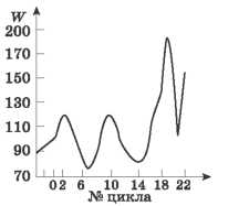 Рис. 5. «Віковий» цикл сонячної активності протягом цього циклу всі ведучі сонячні плями в Північній півкулі мають ту саму полярність, а в Південній півкулі — протилежну. У наступному циклі полярності змінюють свій знак. Полярні магнітні поля мають найбільшу напруженість (до 1 Е) в епоху мінімуму активності й зникають, змінюючи знак біля полюсів в епохи максимумів. Повернення до попередньої магнітної ситуації відбувається через 22 роки, спричиняючи існування 22-річного циклу. Відставання за фазою явищ у високих і низьких широтах веде до відставання на 5 років явищ, пов’язаних з високоширотним магнітним полем Сонця і їхнім впливом на магнітосферу Землі. Сусідні цикли тісно пов’язані між собою. Відносна інтенсивність ll-річних. циклів змінюється з 80-90-річним («віковим») циклом сонячної активності. Установлено існування 1800-річного циклу; можливе існування більш тривалих циклів.