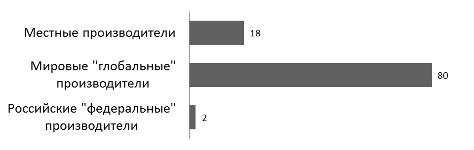 Рисунок 2 – Структура рынка йогурта по производителям в натуральном выражении, % (доли национальных, глобальных и локальных производителей) Структура ассортимента йогуртов в зависимости от массовой доли жира представлена на рисунке 1.