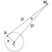 Рис. 1 Якщо зоря М перебуває в полюсі екліптики (рис. 1) і D — її відстань до Землі, a D1 — відстань до Сонця, то ці відстані пов’язані з річним паралаксом відношеннями: