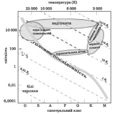 2. Ознайомлення з найважливішими закономірностями у світі зір за діаграмами «Спектр-світність» Головна послідовність На діаграмі Г-Р більшість зір розміщується уздовж діагональної лінії, що йде знизу вгору і зліва направо. Ця смуга називається Головною послідовністю. Зорі, що входять до її складу, називаються зорями Головної послідовності. Сонце належить саме до цієї групи. Зорі Головної послідовності перебувають у найбільш «спокійній фазі» свого існування. У надрах їх ядер атоми Гідрогену перемішуються, утворюється гелій. Фаза Головної послідовності становить 90 % часу існування зорі. Зі 100 зір 90 знаходяться саме в цій фазі, хоча розподіляються по різних позиціях в залежності від температури і світності. Головна послідовність являє собою «вузьку область». Це свідчить про те, що зорі протягом життя зберігають баланс між силою тяжіння, яка тягне всередину, і силою, що утворюється в результаті ядерних реакцій, — вона тягне до зовнішньої сторони зони. Зоря, подібна до Сонця, з поверхневою температурою, яка дорівнює 6000 °С, для підтримки балансу повинна мати абсолютну зоряну величину порядку +4, 7. Це випливає з діаграми Г—Р. Червоні гіганти та білі карлики Червоні гіганти знаходяться у верхній зоні праворуч від розташованої із зовнішнього боку Головної послідовності. Характерною ознакою цих зір є дуже низька температура (приблизно 3000 °С), але при цьому вони яскравіше за зорі, що мають ідентичну температуру і розташовані в Головній послідовності. Природно, постає питання: якщо енергія, випромінювана зорею, залежить від температури, то чому ж зорі однакової температури мають різний ступінь світності. Пояснення слід шукати у розмірі зір. Червоні гіганти більш яскраві тому, що їх поверхня випромінює набагато більше, ніж у зір з Головної послідовності. Невипадково цей тип зір дістав назву «гіганти». Дійсно, їх діаметр може перевищувати діаметр Сонця в 200 разів, ці зорі можуть займати простір в 300 мільйонів кілометрів, що вдвічі більше відстані від Землі до Сонця! Білі карлики — дуже гарячі, але зовсім неяскраві зорі. Попри те, що вони мають однакову температуру з великими і гарячими біло-блакитними зорями Головної послідовності, білі карлики набагато менше їх за розмірами. Це дуже густі і компактні зорі, вони в 100 разів менші від Сонця, їх діаметр приблизно такий самий, як земний. Можна навести яскравий приклад високої густини білих карликів — один кубічний сантиметр матерії, з якої вони складаються, повинен важити близько однієї тонни! Діаграми Г— Р і зоряні скупчення Цікаво розглянути складові зоряних скупчень на діаграмі Г—Р. Припустімо, що всі зорі скупчень розташовані на однаковій від нас відстані. Звідси випливає, що різниця в ступені світності залежить не від віддаленості від нас, а від якихось «внутрішніх» причин. Для побудови діаграми Г—Р використовуємо замість абсолютної зоряної величини відносну (вона легше обчислюється). Що стосується питання розподілу зір в скупченні, можна скласти кілька варіантів діаграми Г—Р. Наприклад, діаграми розсіяних зоряних скупчень М8 чи NGC 2264 будуть значно відрізнятися від «стандартних». Зорі головної послідовності більшою мірою розпорошені, особливо в нижній зоні. Це пов’язано з тим, що зорі розсіяних скупчень відносно молоді і мають вік від декількох десятків до сотень мільйонів років