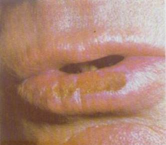 Актинический хейлит (АХ) представляет собой хроническое заболевание, которое обусловлено повышенной чувствительностью красной каймы губ к солнечному свету. Некоторые авторы рассматривают АХ как одну из форм МХ, что является ошибочным, т.к в патогенезе МХ отсутствует фактор аллергии. Основной же причиной возникновения АХ является развитие аллергической реакции замедленного типа к УФ лучам. Мужчины поражаются чаще, возраст от 20 до 60 лет. Процесс обостряется в весенне-летний период, может сочетаться с солнечной экземой лица. Нижняя губа поражается чаще. Клиника. Различают две формы АХ: сухую и экссудативную. При сухой форме вся красная кайма становится сухой, ярко-красного цвета, покрывается мелкими серебристо-белыми чешуйками (рис 4).
