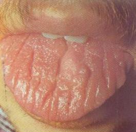 Рис. 14 Складчатый язык: на фоне сосочков языка и сухой слизистой оболочки малинового цвета видны продольные складки