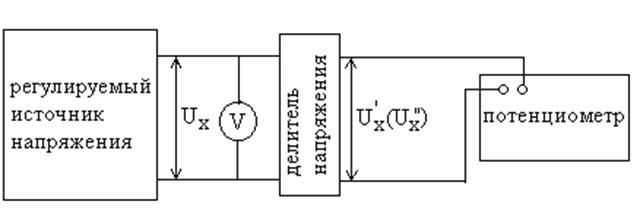 3.1 Поверку цифрового вольтметра выполнить следующим образом: 3.1.1 Подготовить потенциометр к измерению напряжения по методике, изложенной в [2]. 3.1.2 Собрать схему поверки вольтметров (рис.1), строго соблюдая полярность источников питания и приборов. 3.1.3 Плавно изменяя (увеличивая) напряжение (ток) источника питания, последовательно установить ряд значений Ux (Ix), считывая их с соответствующих отметок шкалы и декад потенциометра (Ux').Занести результаты в таблицу 1, графы 1 и 2. 3.1.4 Последовательно уменьшая напряжение до нуля, произвести измерения Ux" при тех же значениях Ux (Ix), что и в предыдущем случае. Результаты занести в таблицу 1, графа 3. 3.1.5 Запишите значение коэффициента делителя - Кд.