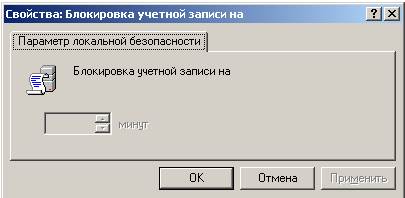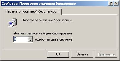 Существует три опции, с помощью которых можно практически исключить возможность проникновения в систему взломщиков, использующих атаку методом перебора пользовательских паролей. Важнейшим параметром является опция Пороговое значение блокировки, которая определяет, будет ли система безопасности отслеживать неудачные попытки входа в систему пользователями, а также после какого их числа будет предпринимать определенные действия. Это необходимо для того, чтобы отслеживать атаки взломщиков, которые основываются на методе повторного ввода пароля в атакуемую систему до тех пор, пока он не совпадет с тем паролем, который установил пользователь или системный администратор. По повторяющимся ошибочным попыткам входа в систему по одному или нескольким пользовательским учетным записям можно отслеживать проведение атак против операционной системы. Система безопасности начнет отслеживать неудачные попытки входа пользователей в систему после того, как в значении данной опции будет задано любое положительное значение, определяющее максимальное количество неудачных попыток входа (рис.7.). После достижения этого числа, учетная запись, под которой было осуществлено данное количество неудачных входов, будет заблокирована системой, в соответствии с настройками системы безопасности. Время блокировки учетной записи зависит от параметра Блокировка учетной записи на, который устанавливается в минутах и по умолчанию имеет значение 30 минут. Таким образом, после определенного количества неудачных попыток входа в систему, заданного параметром Пороговое значение блокировки, произойдет блокировка системы в течение времени, указанного опцией Блокировка учетной записи на. И если значение первого параметра равно 5, а второго – 30, то через каждые пять неправильно введенных паролей, система будет блокироваться на тридцать минут. И в течение этого времени вход в систему будет невозможен для любого пользователя, кроме системного администратора.