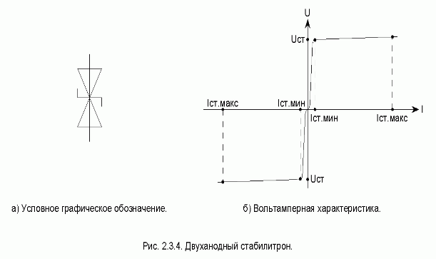 Вольтамперная характеристика двуханодного стабилитрона приведена на рис. 2.3.4б. Принципиальное отличие двуханодного стабилитрона от обычного - симметричность его характеристики: при протекании через двуханодный стабилитрон тока любой полярности (в пределах от IСТ.МИН до IСТ.МАКС) напряжение на двуханодном стабилитроне равно UСТ соответствующей полярности. В действительности, напряжение стабилизации двуханодного стабилитрона равно сумме двух напряжений: напряжения стабилизации стабилитрона и прямого падения напряжения на диоде. Основные параметры некоторых двуханодных стабилитронов малой мощности, применяемых в электронных устройствах РЗА: