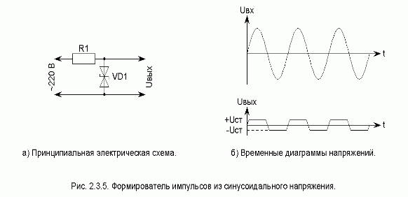 Формирователь импульсов из синусоидального напряжения. Принципиальная электрическая схема формирователя импульсов приведена на рис. 2.3.5а. Резисторы R1, R2 ограничивают ток через стабилитрон VD1.
