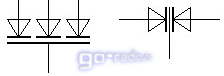 R2 - переменный резистор. С помощью винта по рабочей поверхности этого резистора перемещается ползунок, который плавно изменяет сопротивление, а, соответственно, и величину обратного напряжения (Uобр), подаваемого на варикап. Конденсатор С1 препятствует попаданию на индуктивность L1 постоянного напряжения. Постоянный резистор R1 уменьшает шунтирующее действие резистора R2 на контур, что позволяет сохранить резонансные свойства контура. Как видим, ёмкость варикапа входит в состав колебательного контура. Меняя ёмкость варикапа, мы изменяем параметры колебательного контура и, следовательно, частоту его настройки. Так реализуется электронная настройка. В современных цветных телевизорах есть такая функция – автонастройка (автопоиск) телеканалов. Нажимаем на кнопку, и весь диапазон сканируется на предмет наличия вещательных программ - телеканалов. Так вот этой функции просто бы не существовало, если бы не было варикапа. В телевизоре управляющей схемой формируется плавно меняющееся напряжение настройки, которое и подаётся на варикап. За счёт этого меняются параметры колебательного контура приёмника (тюнера) и он настраивается на тот или иной телеканал. Затем происходит запоминание напряжения настройки на каждый из найденных телеканалов, и мы можем переключаться на любой из них, когда захотим. Кроме обычных варикапов очень часто используют сдвоенные и строенные варикапы с общим катодом. Вот такой вид они имеют на принципиальных схемах.