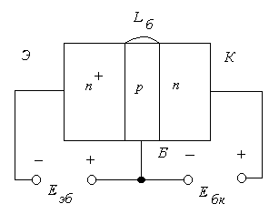 Рис. 5. Как показано на рис., это три области – п-, р- и п. (В принципе может быть и наоборот: р-, п-, р-; все рассуждения относительно такого транзистора будут одинаковы, различие только в полярностях напряжений, такой транзистор называется р-п-р, а мы для простоты будем рассматривать п-р-п, изображённый на рис.) Итак, на рис. изображены три слоя: с электронной электропроводностью, причём сильной, что обозначает плюс - эмиттер, дырочной - база, и снова электронной, но более слабо легированной (концентрация электронов самая малая) – коллектор. Толщина базы, т.е. расстояние между двумя р-п переходами, равное Lб, очень мала. Она должна быть меньше диффузионной длины электронов в базе. Это от единиц до десятка мкм. Толщина базы должна быть не более единиц мкм. (Толщина человеческого волоса 20-50 мкм. Отметим также, что это близко к пределу разрешения человеческого глаза, так как мы не можем видеть ничего меньшего, чем длина волны света, т.е. примерно 0, 5 мкм). Все остальные размеры транзистора не более примерно 1 мм. К слоям прикладывают внешнее напряжение так, что эмиттерный р-п переход смещён в прямом направлении, и через него протекает большой ток, а коллекторный р-п переход смещён в противоположную сторону, так что через него не должен протекать ток. Однако вследствие того, что р-п переходы расположены близко, они влияют друг на друга, и картина меняется: ток электронов, прошедший из эмиттерного р-п перехода, протекает дальше, доходит до коллекторного р-п перехода и электрическим полем последнего электроны втягиваются в коллектор. В результате у хороших транзисторов практически весь ток коллектора равен току эмиттера. Потери тока очень незначительны: проценты и даже доли процента.