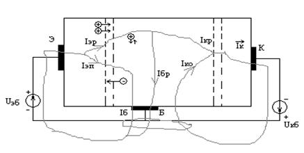 Iэп значительно меньше чем Iэр. γ =Iэр/(Iэр+Iэп)=Iэр/Iэ. γ -> 0.95 и выше. База всегда электрически нейтральна. к(каппа)=Iкр/Iэр. Iэ=Iэп+Iэр. Iэр=Iкр+Iбр. α =Iкр/Iэ. α =γ к. Iк=Iкр+Iко=α Iэ+Iко. Iко-ток коллекторного перехода. Iб=Iэп+Iбр-Iко. Iэ=Iк+Iб. Iб=Iэ-Iк=1-α Iэ-Iко. Вывод: принцип действия биполярного транзистора основан на создании транзитного потока носителей заряда из эмиттера в коллектор через базу и на управлении выходным (коллекторным) током за счет входного(эмиттерного) т.е. биполярный транзистор управляется током. Режим отсечки Когда напряжение база-эмиттер ниже, чем 0.6V - 0.7V, PN-переход между базой и эмиттером закрыт. В таком состоянии у транзистора отсутствует ток базы. В результате тока коллектора тоже не будет, поскольку в базе нет свободных электронов, готовых двигаться в сторону напряжения на коллекторе. Получается, что транзистор как бы заперт, и говорят, что он находится в режиме отсечки.