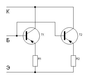 При таком включении нужно стремиться использовать транзисторы с близкими параметрами Вст. Транзисторы большой мощности при этом должны устанавливаться на один теплоотвод. Для дополнительного выравнивания токов в данной схеме в цепях эмиттеров применены резисторы. Сопротивление резисторов следует выбирать исходя из падения напряжения на них (в интервале рабочих токов) около 1 вольта (или, по крайней мере, - не менее 0, 7 вольта). Данная схема должна применяться с большой осторожностью, так как даже транзисторы одного типа и из одной партии выпуска имеют очень большой разброс по параметрам. Выход из строя одного из транзисторов неизбежно приведет к выходу из строя и других транзисторов в цепочке... При параллельном включении двух транзисторов максимальный суммарный ток коллектора не должен превышать 1, 6-1, 7 от предельного тока коллектора одного из транзисторов! Количество транзисторов, включенных по этой схеме может быть сколько угодно большим - все зависит от целесообразности... В радиолюбительской практике иногда необходим транзистор с проводимостью, отличной от имеющегося (например - в выходном каскаде УЗЧ и проч.). Выйти из положения позволяет схема включения, приведенная ниже: