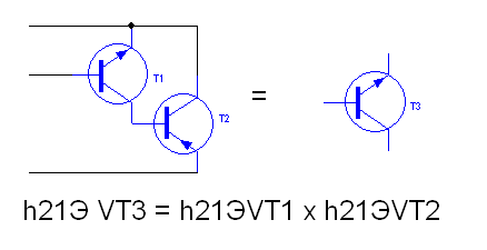 В данном каскаде используется как правило маломощный транзистор VT1 необходимой проводимости, транзистор VT2 необходимой мощности, но другой проводимости. Данный каскад (в частности) эквивалентен транзистору с проводимостью N-P-N большой мощности с высоким коэффициентом передачи тока базы (h21Э). Если мы используем в качестве VT1, VT2 транзисторы противоположной проводимости - получим мощный составной транзистор с проводимостью P-N-P. Если в данной схеме применить транзисторы одной структуры - получим так называемый Составной транзистор. Такое включение транзисторов называют Схемой Дарлингтона. Промышленность выпускает такие транзисторы в одном корпусе. Существуют как маломощные (типа КТ3102 и т.п.) так и мощные (например - КТ825) составные транзисторы. Инверсное включение используется редко, например, в схемах двуна- правленных переключателей, при этом транзисторы должны иметь сим- метричные свойства в обоих направлениях. – Инверсное включение – когда на эмиттерный переход подано обратное напря- жение, на коллекторный – прямое. Передача тока при этом значительно хуже, чем при нормальном включении, во-первых, из-за того, что коллектор легирован слабее, во- вторых, размеры эмиттера меньше, чем коллектора, и только часть зарядов попадает в эмиттер.