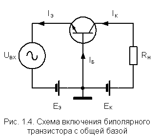 Схемы включения транзисторов получили своё название в зависимости от того, какой из выводов транзисторов будет являться общим для входной и выходной цепи. Схема включения транзистора с общей базой приведена на рис. 1.4.