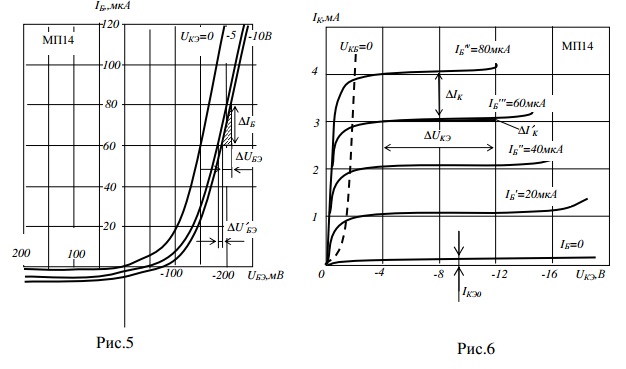 Семейства входных и выходных характеристик приведены на рис.5 и 6. Входная характеристика при UКЭ=0 соответствует диодному включению транзи- стора, когда оба перехода соединены параллельно. При прямом смещении переходы от- крываются, и ток возрастает по экспоненциальному закону.