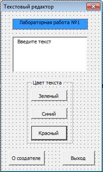 Например, чтобы при нажатии кнопки «Зеленый» у элемента текстовое поле Text1 свойство ForeColor (цвет текста) принимало значение vbGreen (зеленый), добавьте в программном коде текст TextBox1.ForeColor= vbGreen. Варианты задания 1. Добавьте 3 кнопки для изменения цвета фона текста на белый, желтый, зеленый (vbWhite, vbYellow). 2. Добавьте 3 переключателя для изменения выравнивания текста по левому краю, по правому краю, по центру. 3. Добавьте 3 флажка для изменения начертания текста на полужирный (FontBold), курсив (FontItalic), подчеркнутый (FontUnderline). Они могут принимать значения True и False. 4. Добавьте 3 кнопки для изменения вида указателя мыши на значения fmMousePointerHelp, fmMousePointerCross, fmMousePointerHourGlass. 5. Добавьте 3 переключателя для изменения ширины окна отводимого под надпись. 6. Добавьте 3 флажка: два – для запрещения или разрешения многострочного режима ввода и один – для задания максимальной длины надписи, которая может быть введена в окне. 7. Добавьте 3 кнопки: две – для изменения стиля бордюра окна и третья – для запрета редактирования текста в окне. 8. Добавьте 3 переключателя для изменения высоты окна отводимого под надпись. 9. Добавьте 3 флажка для изменения расположения окна относительно левого края формы. 10. Добавьте 3 кнопки для изменения расположения окна относительно верхнего края формы.