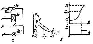 Характер и продолжительность переходного процесса, вызванного скачкообразным изменением параметров цепи, будут меняться в зависимости от значений этих параметров и их комбинаций. Время протекания переходных процессов, возникающих в электрической цепи содержащей ПТР, может быть использовано для получения выдержек времени различной продолжительности. Простейшая схема реле времени состоит из электромагнитного реле, включенного последовательно с ПТР (рис.2.2). Выдержка осуществляется за счет времени, необходимого для нарастания тока до значения тока срабатывания реле. Началом отсчета является момент подключения цепи с ПТР к источнику напряжения. Для выполнения лабораторной работы используются: универсальный источник питания; полупроводниковый терморезистор; электромагнитное реле постоянного тока РЭС-10; добавочное сопротивление (магазин сопротивлений); термостат; секундомер; термометр; монтажная плата с проводниками и сигнальной лампой.